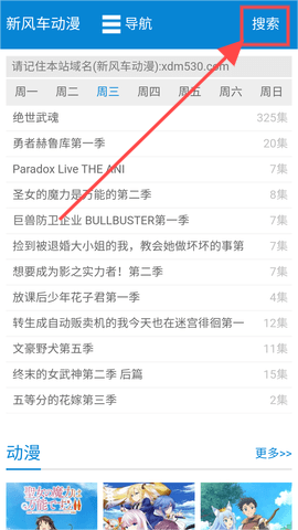 1、打开新风车动漫app,点击右上角搜索按钮通过其他方式,找到想看的动漫一样