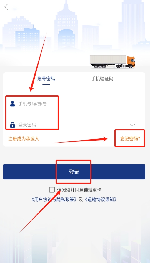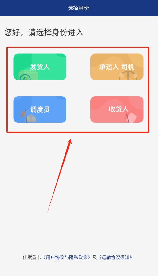 1、打开软件先选身份,司机货主还是管理员,不同身份看到的功能界面不太一样。