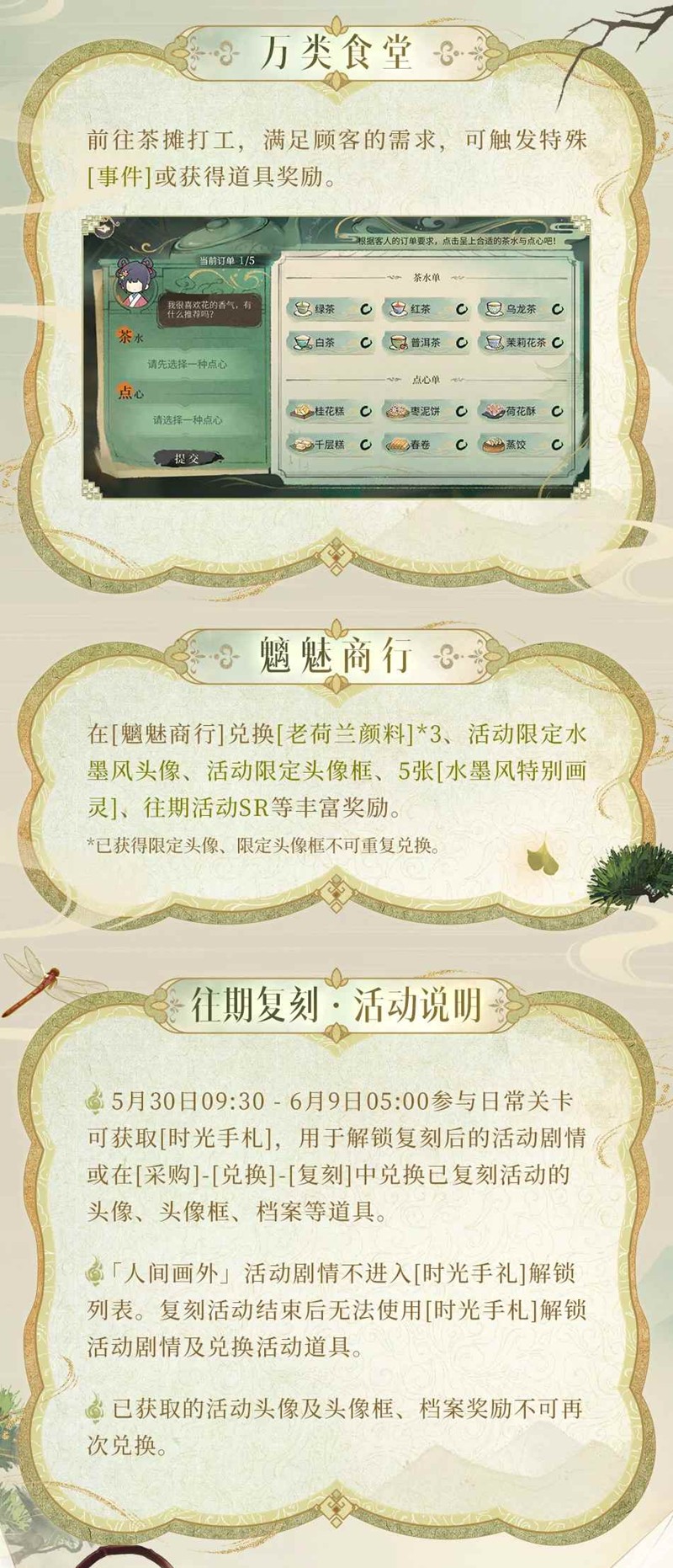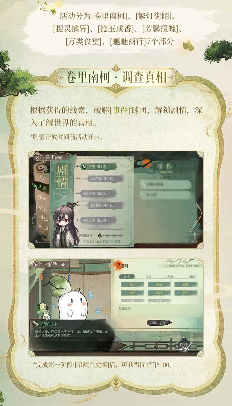 复刻活动分为[卷里南柯]、[繁灯街陌]、[捉灵擒异]、[捻玉成香]、[芳馨摄魄]、[万类食堂]、[魑魅商行]7个部分。