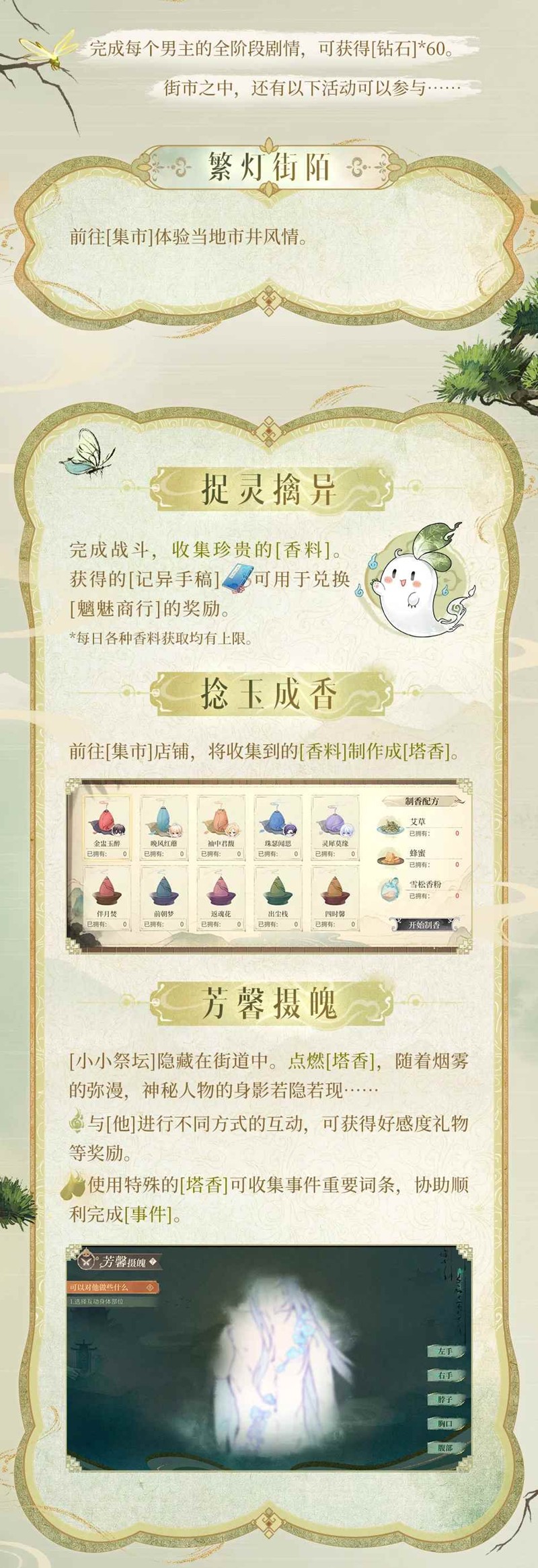 ► [捉灵擒异]获得[香料],制作[塔香]。在[小小祭坛]中点燃[塔香],与神秘人物的身影互动获得奖励及事件词条。